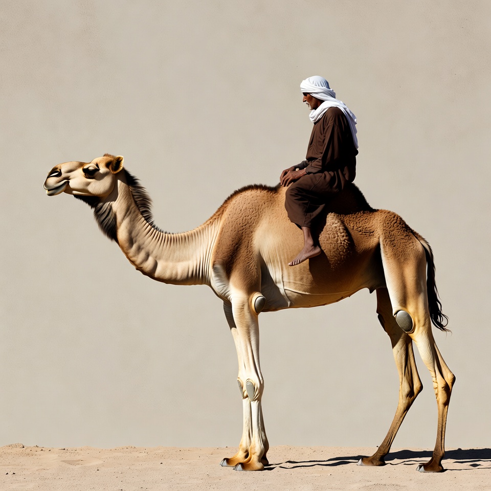 A Middle Eastern man wearing a white headscarf and brown robe sits atop a dromedary camel. The camel stands on a sandy beige background with its mouth slightly open. The man holds the reins while seated barefoot on the camel's hump.