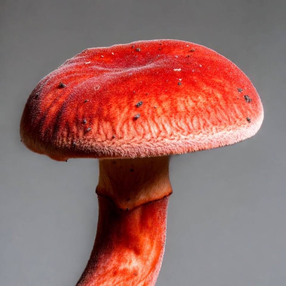 A vibrant red mushroom with a velvety cap covered in small dark specks stands prominently against a plain gray background. The cap is convex and textured, transitioning to a slender stem with similar reddish hues. The mushroom is isolated and centered in the frame.