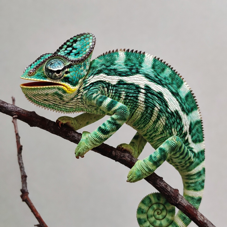 animal, big eyes, branch, camouflage, coiled tail, crest, exotic pet, green chameleon, isolated background, lizard, nature, open mouth, reptile, scales, wildlife, yellow tongue, chameleon