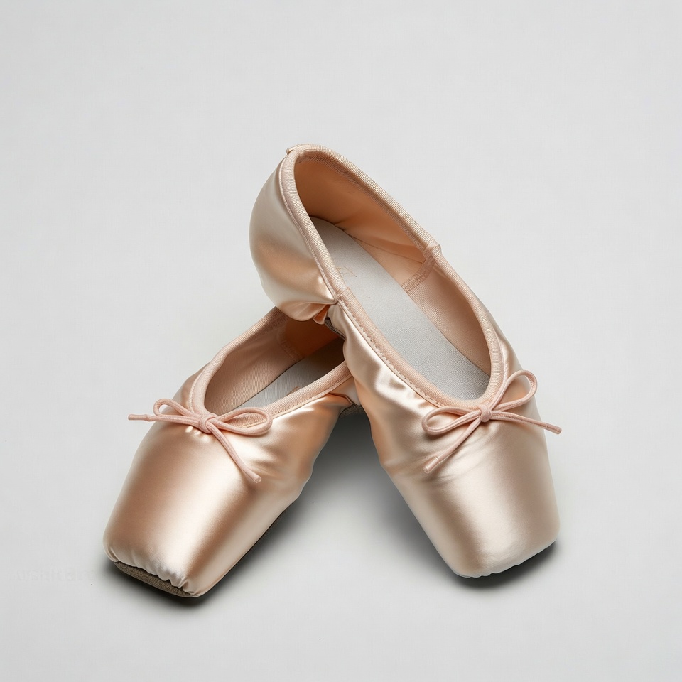 A pair of pink satin ballet pointe shoes with ribbons lies crossed on a white background. The shoes feature reinforced toes and soft pink fabric with delicate bows. They are positioned to show both the top and side views clearly.