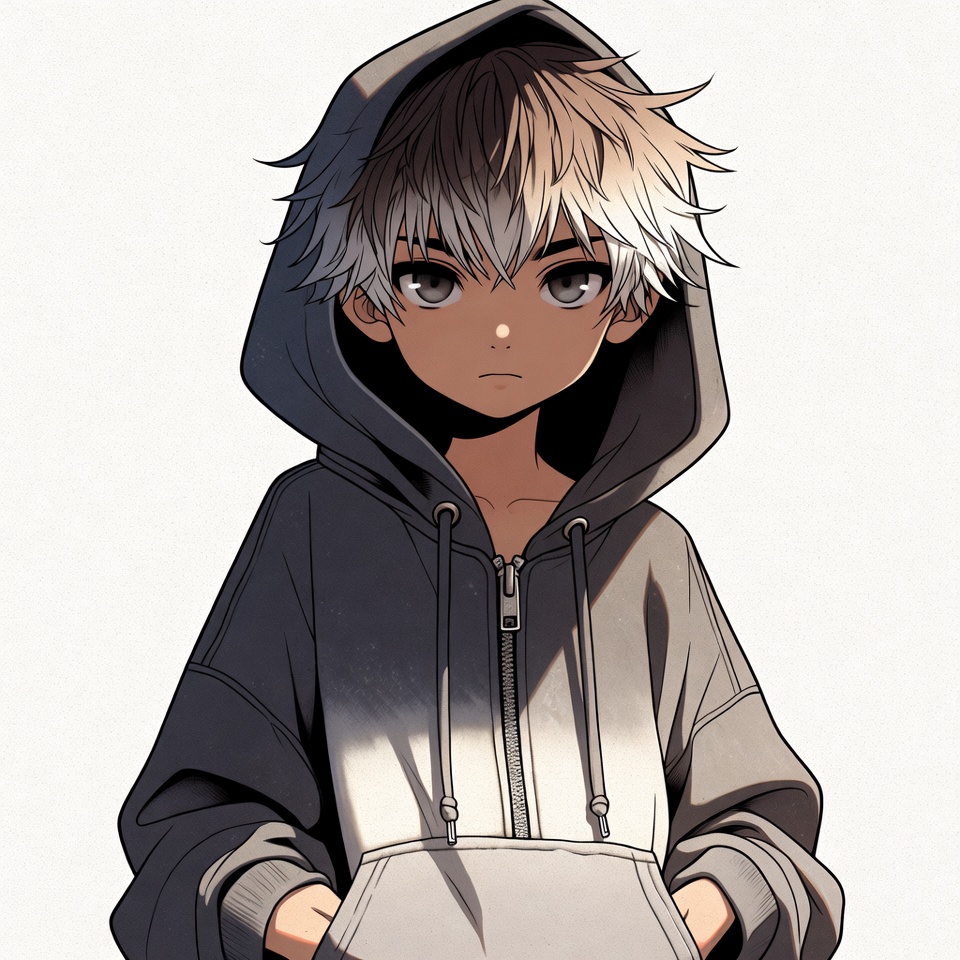 An anime-style illustration of a young boy with short white hair and brown skin wearing a gray zip-up hoodie with the hood up. He stands with hands in the front pocket, showing a serious expression with narrowed eyes. The image features a plain white background.