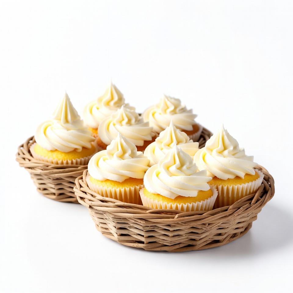 baked goods, basket arrangement, desserts, food photography, frosting swirls, isolated background, pastry, sweet treats, swirled frosting, vanilla cupcakes, white frosting, wicker baskets, yellow cupcakes, cupcakes