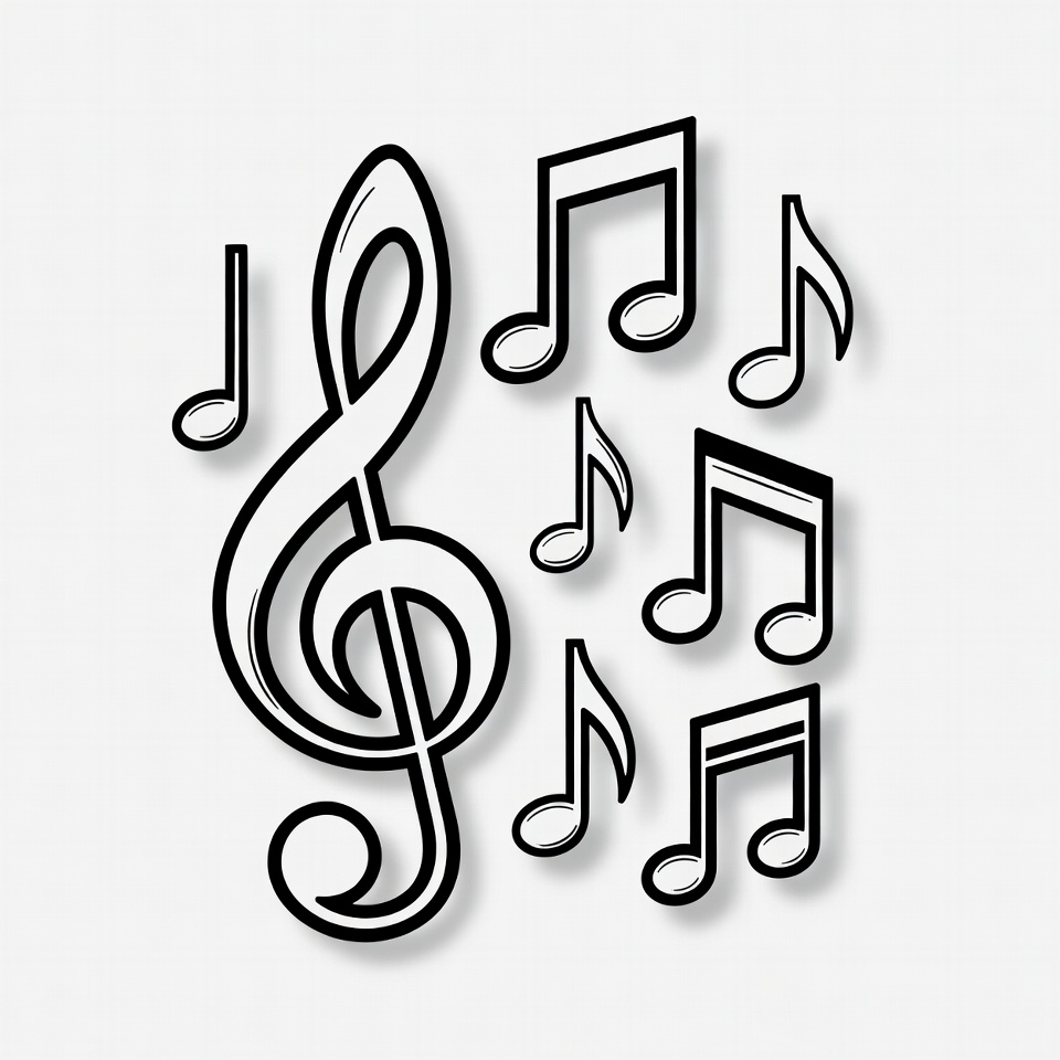 black outline, cartoon notes, clef, clipart, graphic design, illustration, isolated, melody, music clipart, music icon, music symbols, musical notes, notes, rhythm, sheet music, simple illustration, sound notes, vector art, white background, treble clef