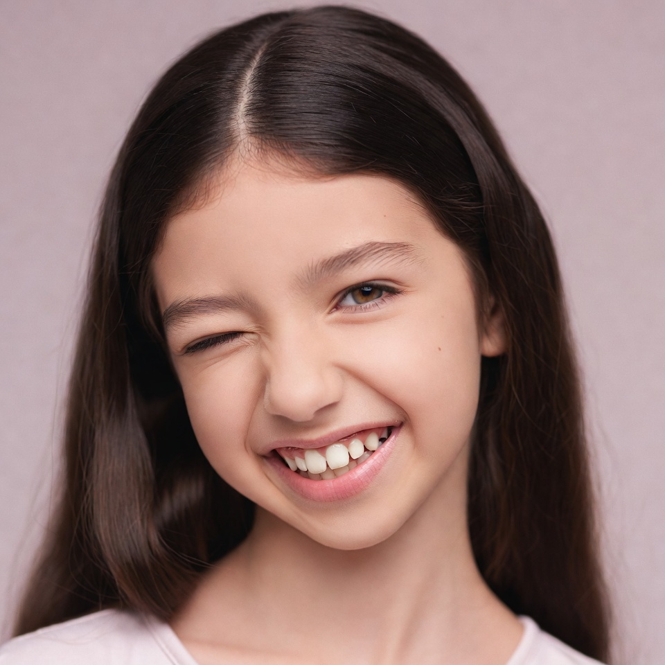 A young girl with long dark brown hair winks one eye while smiling widely, showing her teeth. Her face is close-up against a light pink background. She has fair skin and expressive facial features.