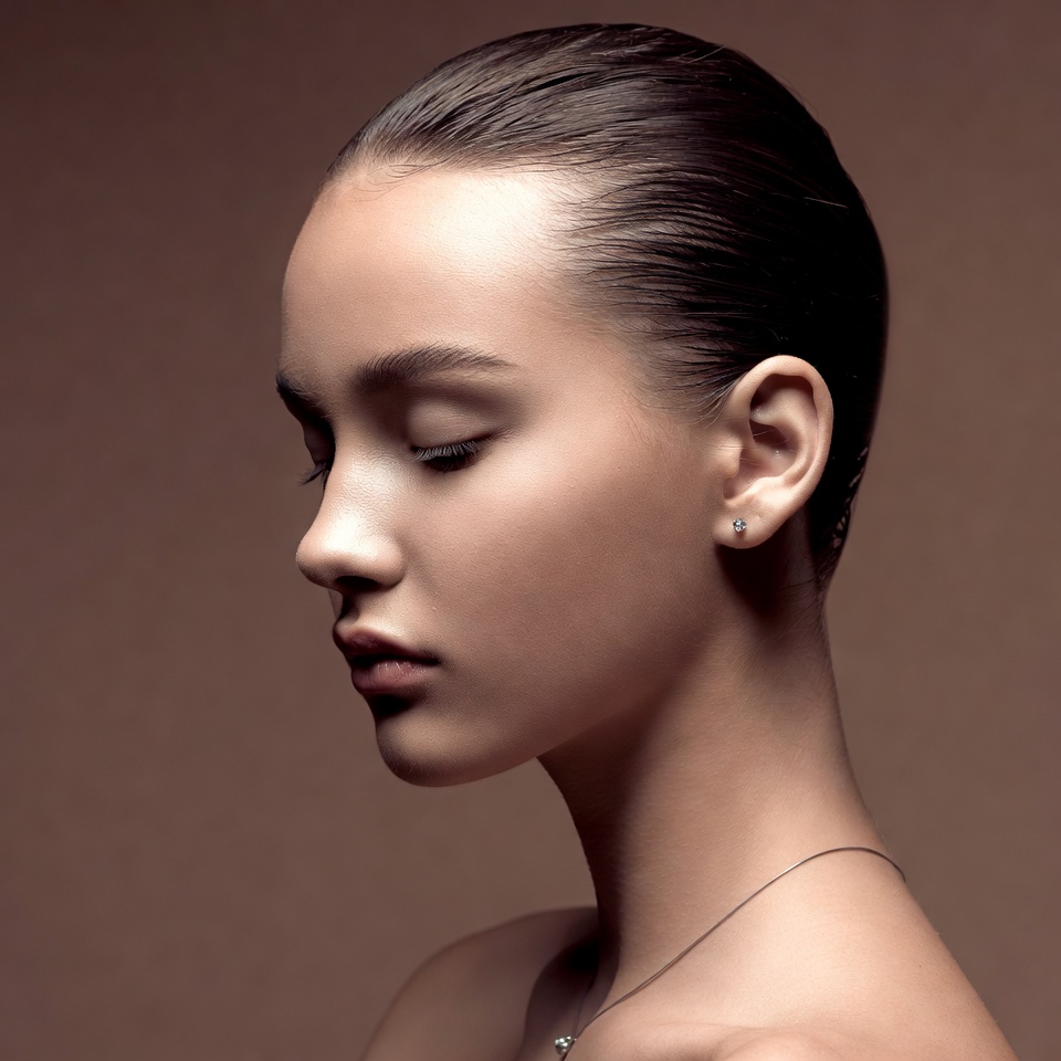 A young woman with sleek black hair in a bun poses in profile view against a warm brown background. Her eyes are gently closed, and she wears small stud earrings and a delicate necklace. Her smooth skin and serene expression are highlighted by soft lighting.