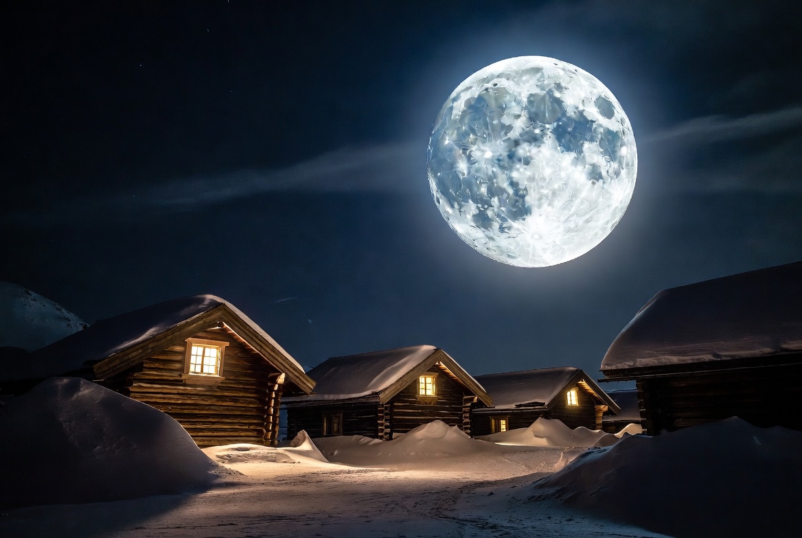 arctic cabins, bright moon, cabin lights, cabins at night, clouds, dark sky, frozen landscape, illuminated windows, log cabins, lunar night, moon craters, moon glow, moonlit snow, night sky, remote cabins, snow, snow drifts, snowy cabins, snowy path, snowy village, winter landscape, winter night, winter scene, wooden cabins, full moon