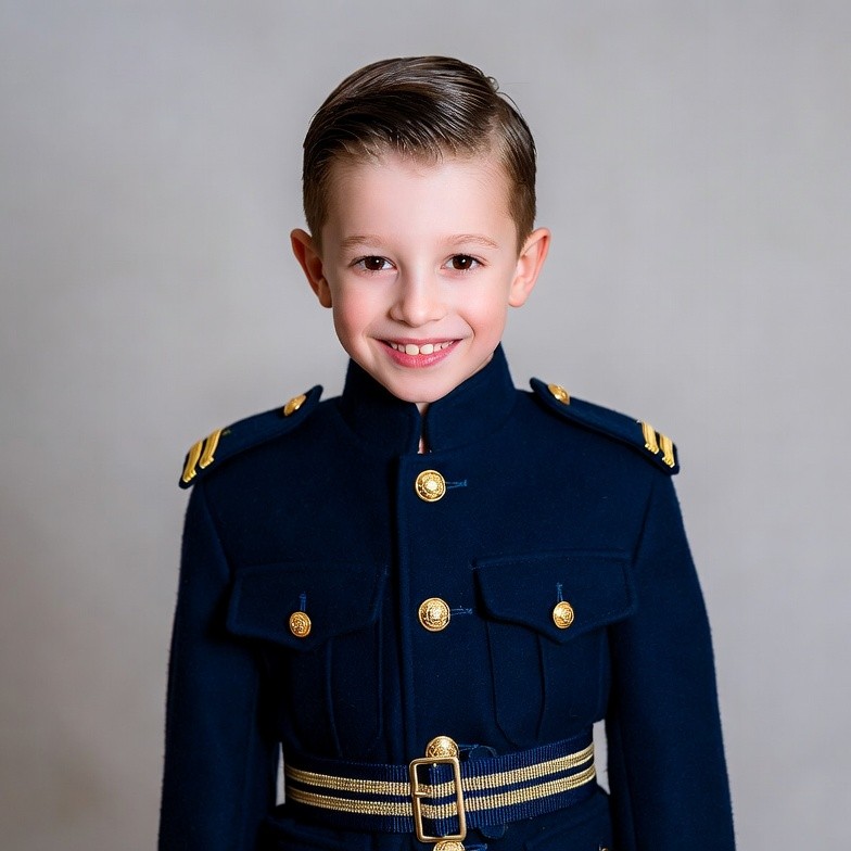 A young boy with neatly combed brown hair stands smiling in a dark blue military-style uniform. The uniform features gold buttons, epaulets, and a wide gold belt on a plain gray background. He looks directly at the camera with a cheerful expression.