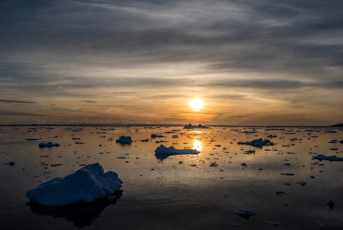 Arctic, clouds, cold, dramatic sky, floating ice, frozen water, horizon, ice, icy waters, nature, ocean, orange sky, polar landscape, reflection, seascape, sun, sunset, twilight, winter, icebergs
