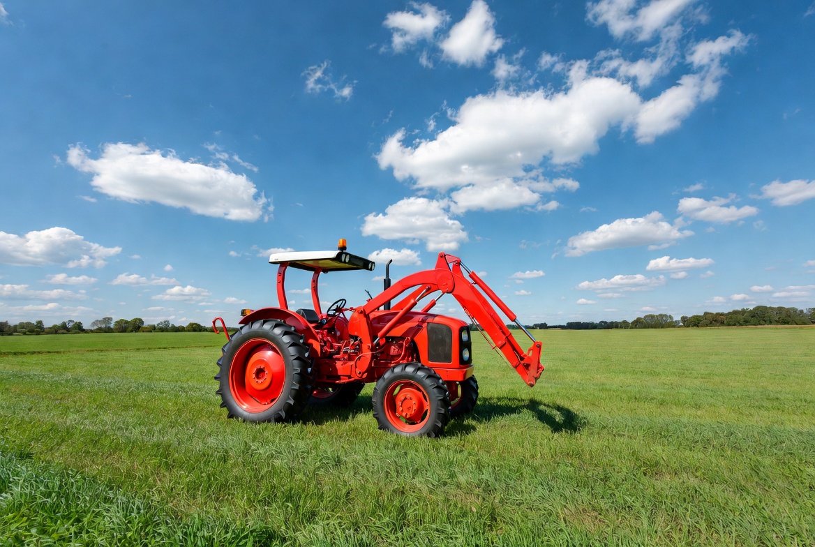 agriculture, blue sky, cab, countryside, farm equipment, farm tractor, farming, field, front loader, grass, green field, loader tractor, machinery, outdoor, rural, tires, tractor, wheels, white clouds, red tractor