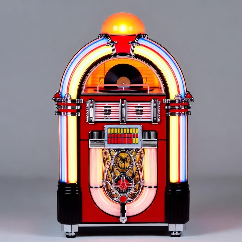 1950s jukebox, classic jukebox, coin operated, colorful arches, glowing light, illuminated jukebox, isolated background, music machine, neon lights, record player, red jukebox, retro jukebox, vintage jukebox, vinyl record, jukebox