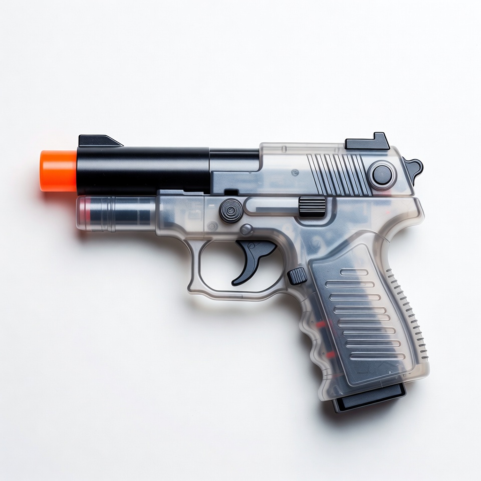 BB gun, airsoft gun, airsoft handgun, black accents, clear pistol, clear plastic, handgun, isolated background, laser sight, muzzle tip, orange tip, pistol grip, plastic pistol, red laser, slide action, toy, toy gun, toy weapon, transparent gun, weapon toy, airsoft pistol
