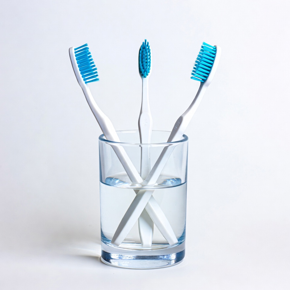Three white toothbrushes with blue bristles stand upright in a clear glass partially filled with water. The toothbrushes are crossed at the handles inside the transparent glass. The setup is isolated against a plain white background.