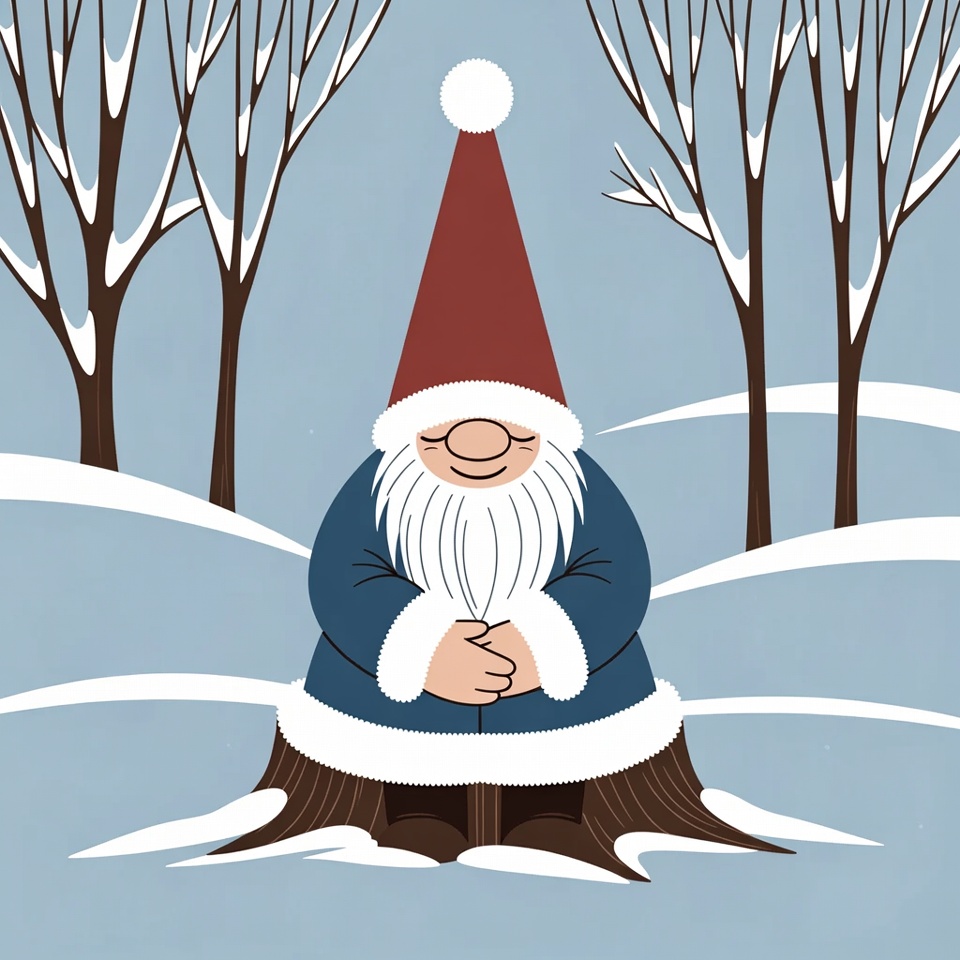 A cheerful cartoon garden gnome with a tall red hat and white beard sits on a snow-covered tree stump. He wears a blue coat with white trim and holds his hands together while smiling. Bare winter trees and snow surround him on a light blue background.