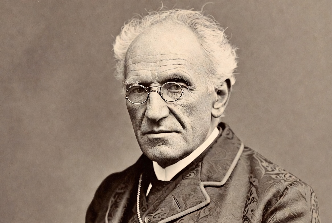 An elderly White man with white hair and round glasses stares directly at the camera. He wears a formal Victorian-era suit with a high collar and ornate fabric details. The sepia-toned portrait shows him against a plain background.
