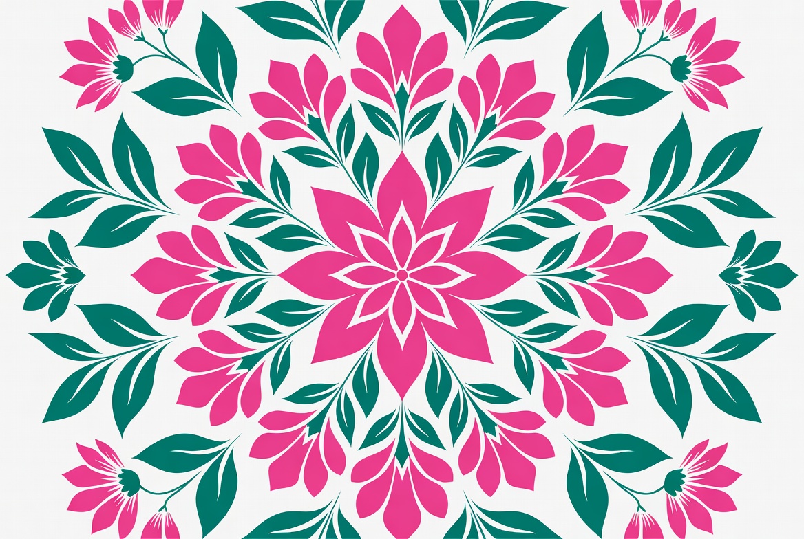 abstract design, clipart, decorative flower, digital illustration, floral pattern, flower illustration, green leaves, isolated background, leaf motifs, mandala design, pink blooms, pink flowers, symmetrical pattern, vector art, floral mandala