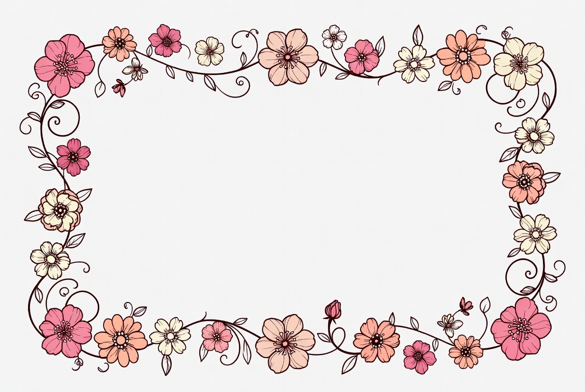A hand-drawn illustration of a rectangular frame made with pink, orange, and white flowers connected by swirling vines. Delicate flowers in various sizes border the empty white space inside. The design features a sketchy, doodle style with fine lines.