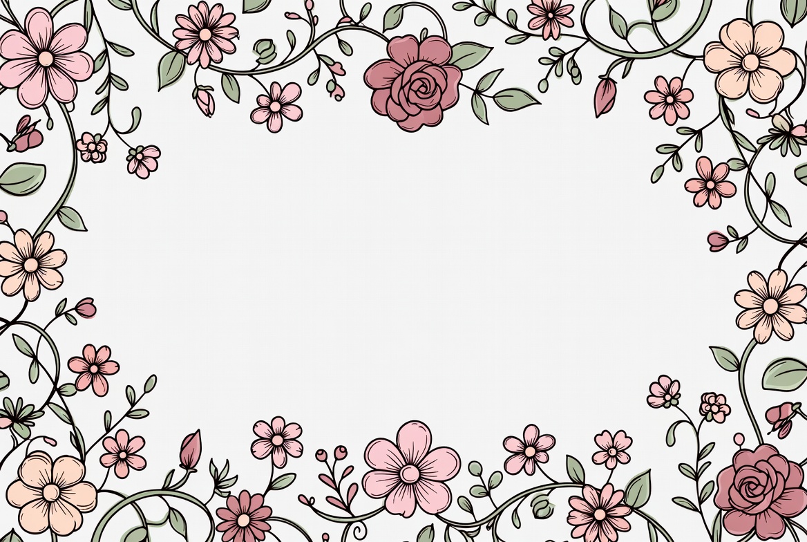 A delicate hand-drawn illustration features pink and peach flowers intertwined with green vines forming a rectangular border. The center remains a blank white space. Roses and small blossoms adorn the ornate frame on an isolated background.