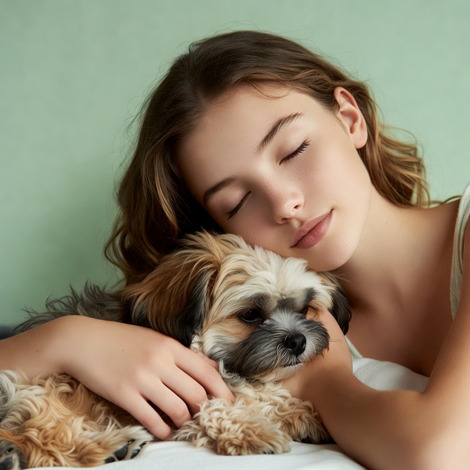 A young girl with long wavy brown hair lies on a bed, gently hugging a fluffy Shih Tzu puppy. Both the girl and the puppy have their eyes closed in a peaceful embrace. She wears a light-colored tank top, and the scene is set against a soft green background.