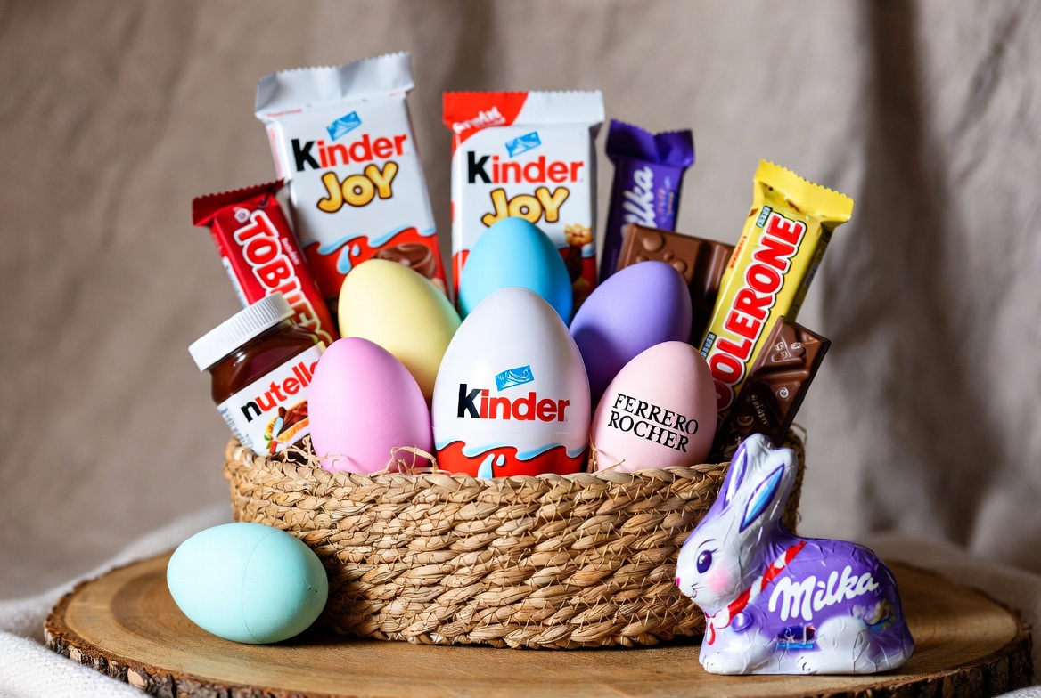 Easter candy, Easter eggs, Ferrero Rocher, Kinder Joy, Kinder chocolate, Milka, Nutella, blue eggs, bunny figure, candy basket, chocolate bars, chocolate eggs, chocolate treats, egg basket, festive basket, green eggs, holiday treats, pastel eggs, pink eggs, purple bunny, wooden surface, woven basket, yellow eggs, Easter basket