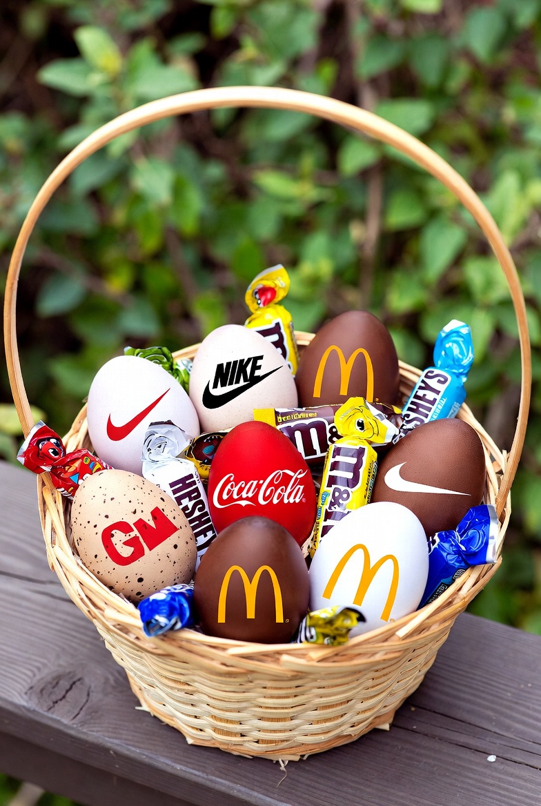 A wicker basket filled with colorful Easter eggs decorated with popular brand logos sits on a wooden surface. The eggs feature designs from Nike, Coca-Cola, McDonald's, Hershey's, and M&M's, surrounded by green foliage and wrapped candies. The basket handle is arched and empty.