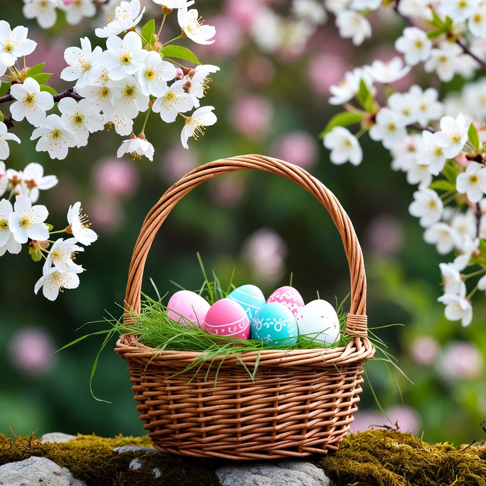 A woven brown basket filled with colorful Easter eggs in pink, blue, green, and white sits on mossy rocks. The basket is lined with fresh green grass and surrounded by blooming white cherry blossoms. Soft green foliage provides a natural spring background.