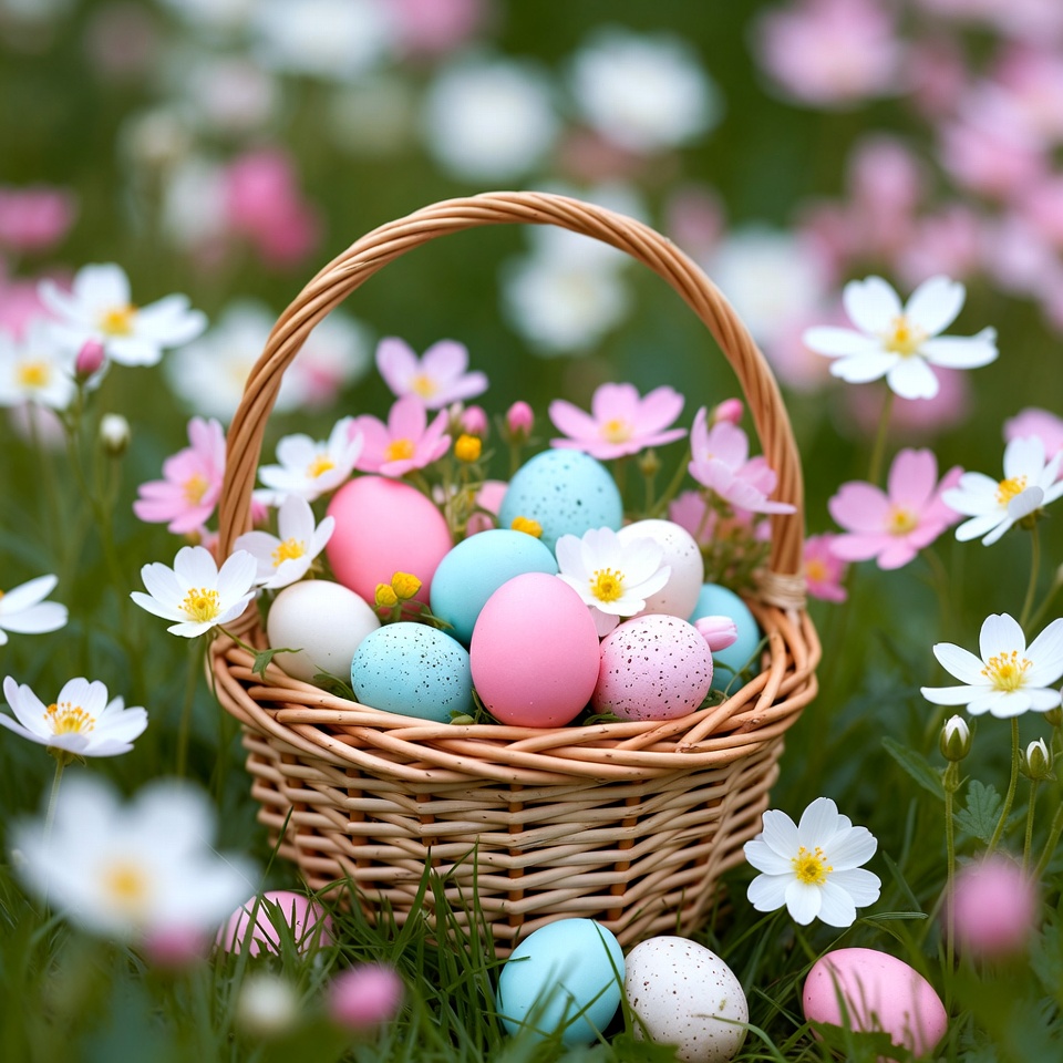 A wicker basket filled with pastel-colored Easter eggs sits on green grass surrounded by white and pink flowers. The eggs in shades of pink, blue, white, and green are speckled and nestled among the blooms. Additional eggs are scattered around the base of the basket.