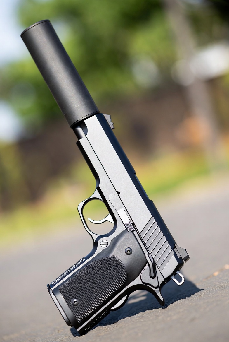 1911 style, black gun, blurred background, firearm, grass, gun grip, handgun, matte black, outdoor, pavement, semi-automatic, shooting accessory, silenced pistol, silencer, suppressor, tactical pistol, trees, weapon, pistol