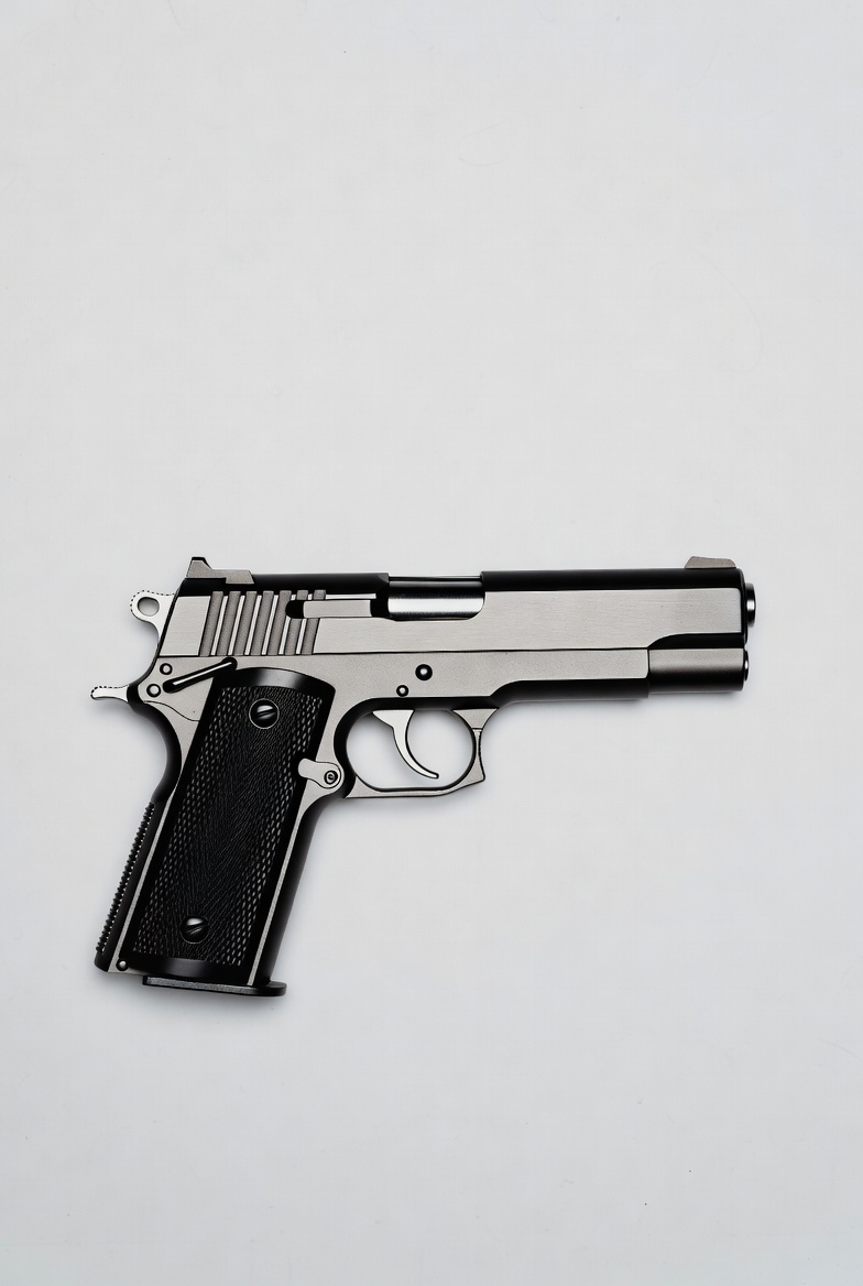 Silver 1911 pistol on white background