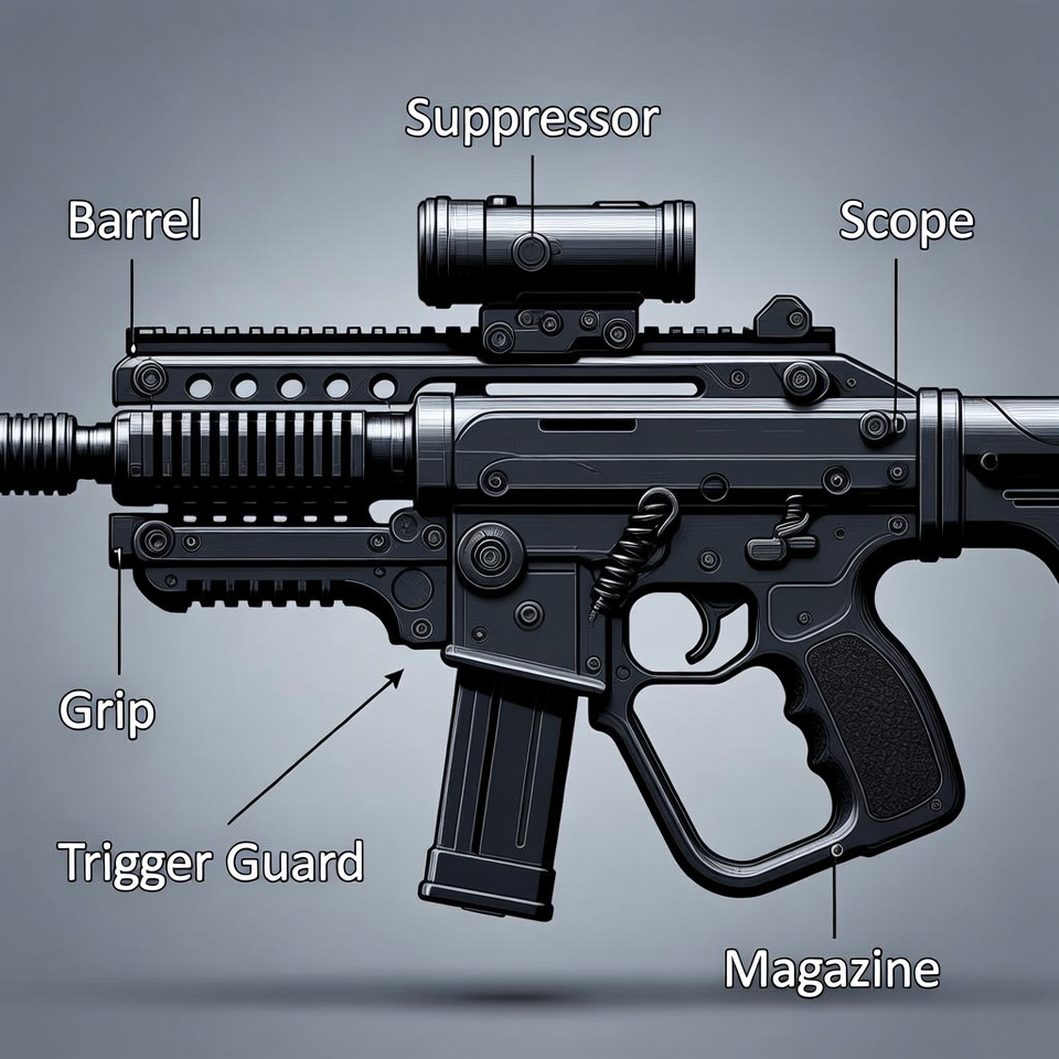 barrel, black rifle, clipart, firearm, grip, gun, illustration, isolated background, labeled diagram, magazine, red dot sight, rifle, scope, silencer, suppressor, tactical rifle, trigger guard, weapon, assault rifle
