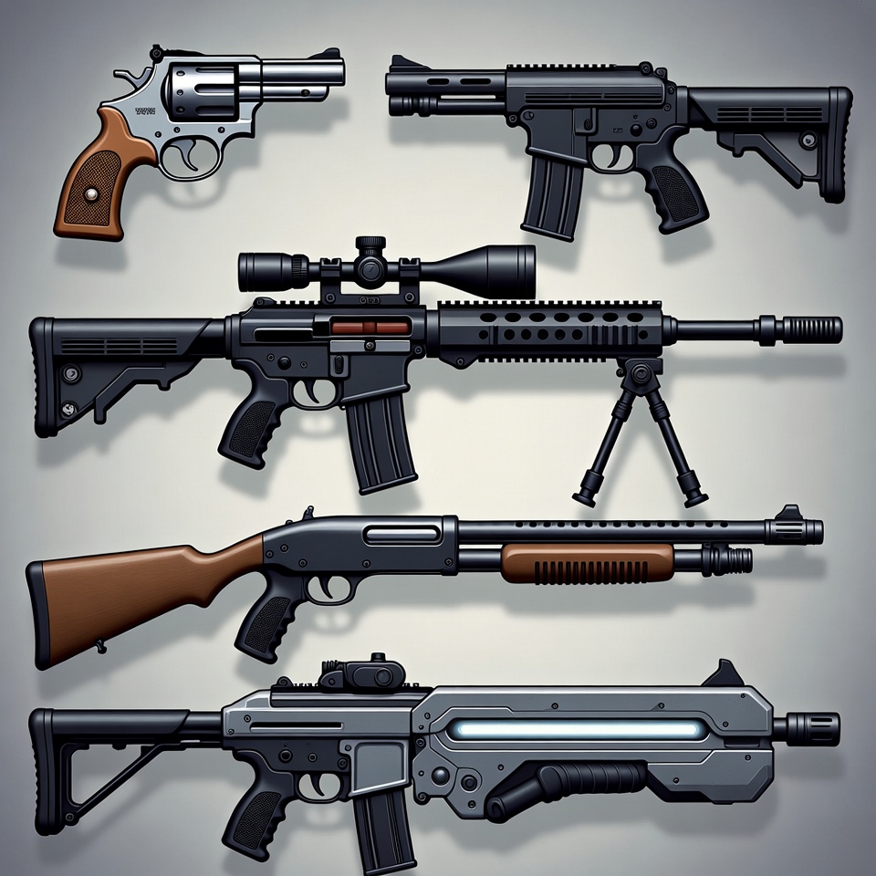 AR-15, arsenal, assault rifle, black guns, clipart, combat weapons, detailed, firearms, firepower, futuristic gun, gun collection, illustration, isolated background, metallic, pistol, pump shotgun, revolver, revolver pistol, rifle, sci-fi weapon, shotgun, sniper rifle, vector art, weapons, guns