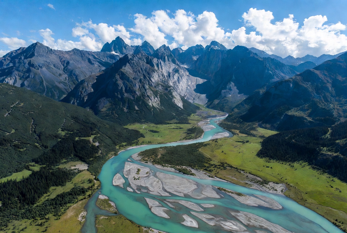 aerial photography, alpine mountains, blue sky, braided river, clear water, dramatic peaks, european mountains, forested slopes, glacier river, green valley, high altitude, jagged peaks, lush greenery, mountain landscape, mountain range, nature scenery, outdoor landscape, river valley, rocky riverbed, snow-capped peaks, swiss alps, turquoise river, valley floor, white clouds, winding river, aerial view