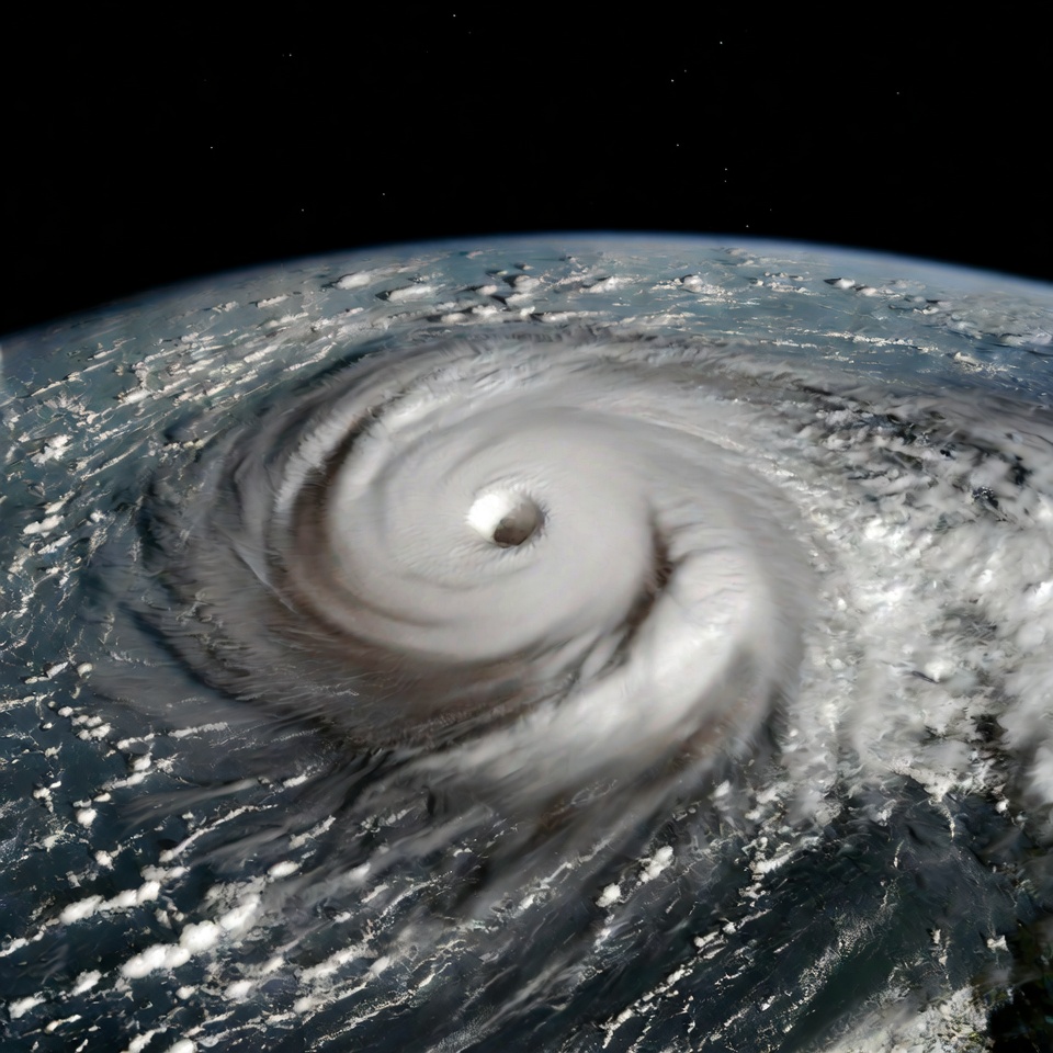 A massive hurricane swirls over the Earth's surface, viewed from space against a black cosmic background. The storm features a distinct white eye at its center surrounded by thick spiral cloud bands. The planet's blue oceans and white clouds are partially visible beneath the rotating cyclone.