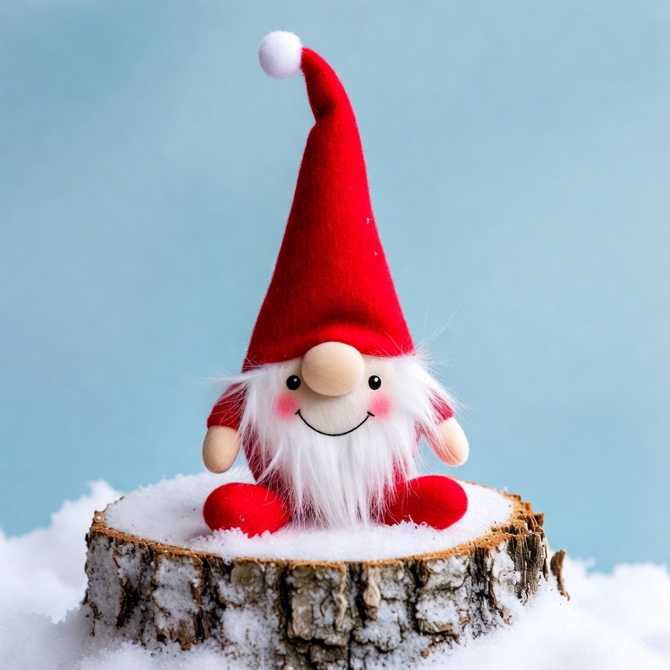 A cute felt gnome with a red hat, white beard, and rosy cheeks sits on a snowy tree stump. It has a cheerful smile and fluffy white snow covering the base against a blue background. The gnome's red pants and arms are visible, giving it a playful holiday appearance.