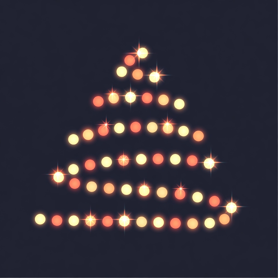 A digital illustration of a Christmas tree formed by glowing multicolored lights on a dark background. The lights in orange, yellow, and white create a triangular tree shape with a sparkling bokeh effect. No people or additional objects are present.