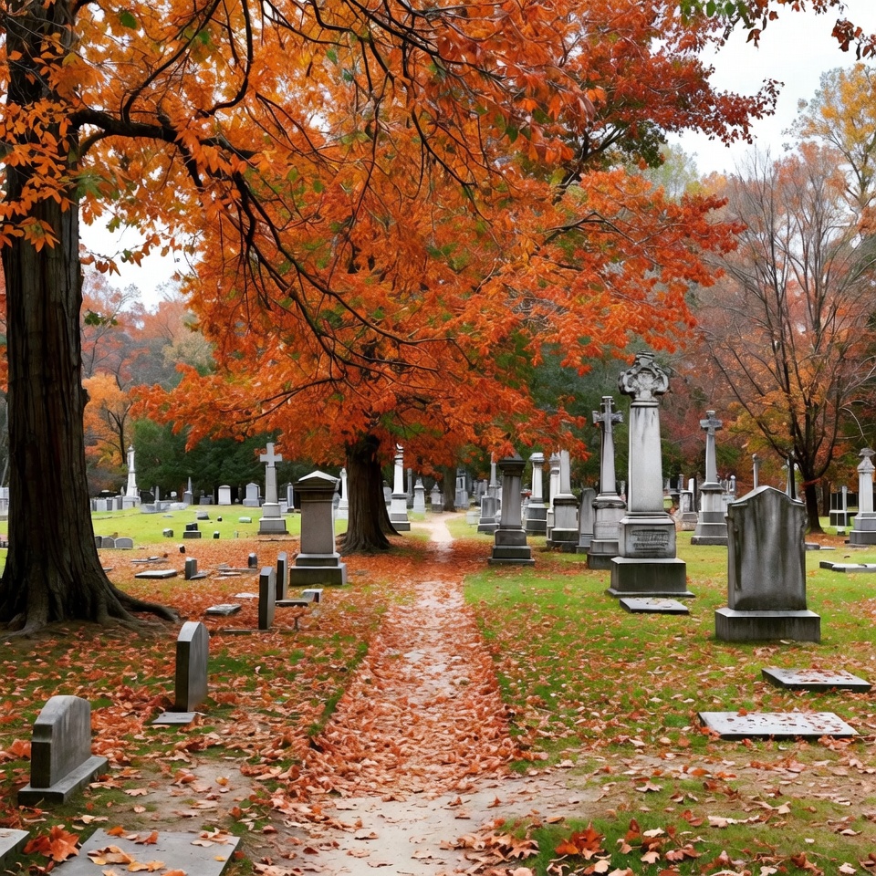 autumn, autumn scenery, burial ground, cemetery path, fall colors, fall leaves, foliage, grass, gravestones, graveyard, headstones, historic cemetery, leaf covered path, maple trees, monuments, orange trees, overcast sky, path, seasonal landscape, stone markers, tombstones, tree branches, vibrant leaves, wooded cemetery, cemetery