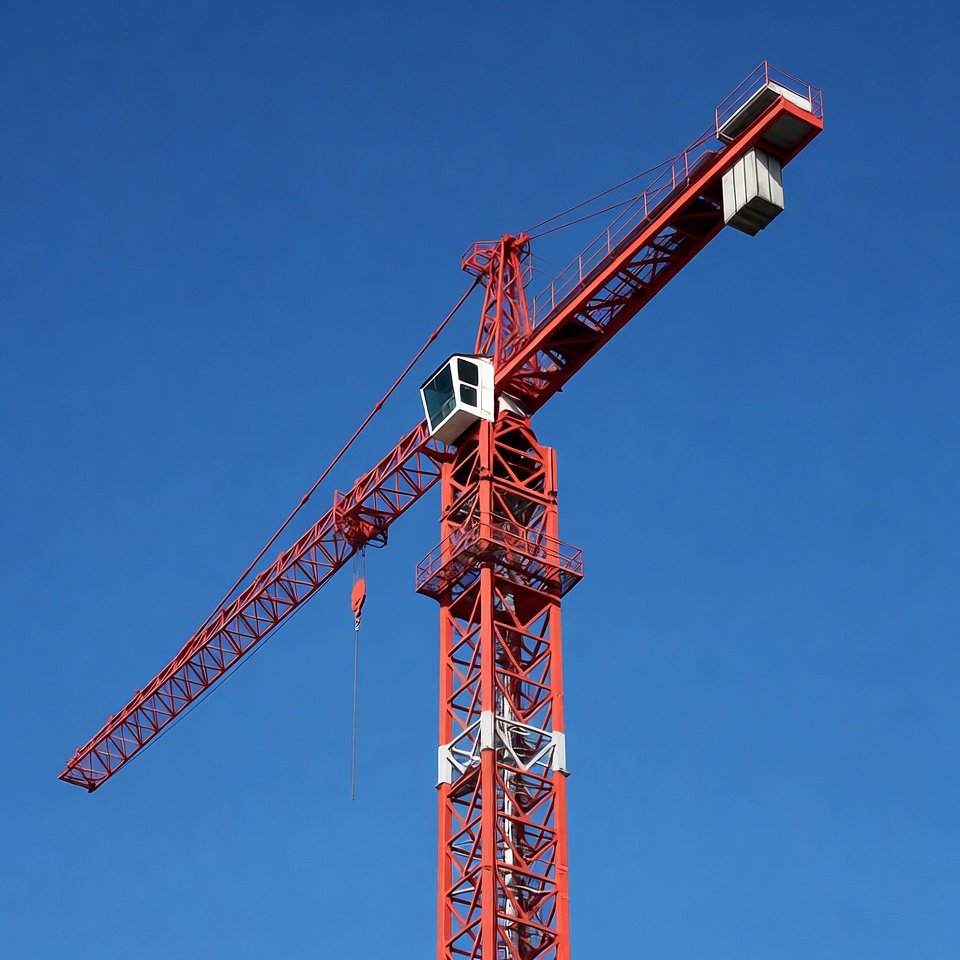 blue sky, building crane, cables, construction crane, construction equipment, construction site, crane, engineering, heavy machinery, hook, industrial crane, jib, machinery, operator cab, red crane, steel structure, tall crane, tower crane