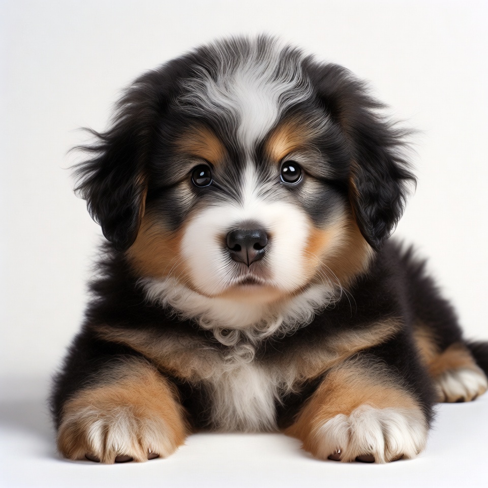 A fluffy Bernese Mountain Dog puppy lies on a white background with its front paws extended forward. The puppy has a tri-colored coat of black, white, and rust, with expressive eyes and a small pink nose. Its fur is soft and wavy, giving it an adorable, playful appearance.