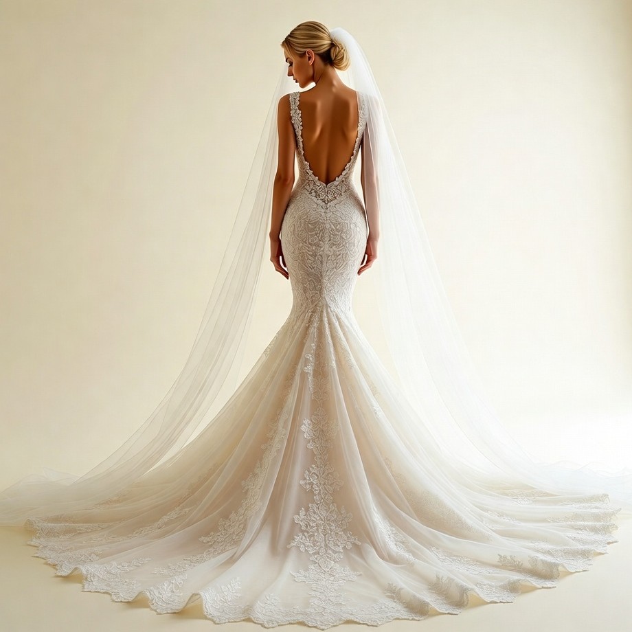 White, backless dress, blonde hair, bridal fashion, elegant bride, female, flared train, gown train, isolated background, lace detailing, lace gown, long veil, mermaid gown, open back, rear view, updo, veil, wedding dress, wedding gown, white dress, woman, bride