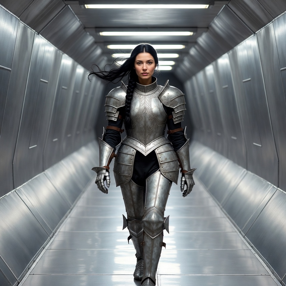 Middle Eastern, armor, armored woman, boots, braided hair, chest plate, corridor, dark hair, female, female knight, futuristic corridor, gauntlets, knight, lights, long hair, medieval armor, metallic walls, sci-fi hallway, sci-fi woman, silver armor, tunnel, walking, warrior, woman
