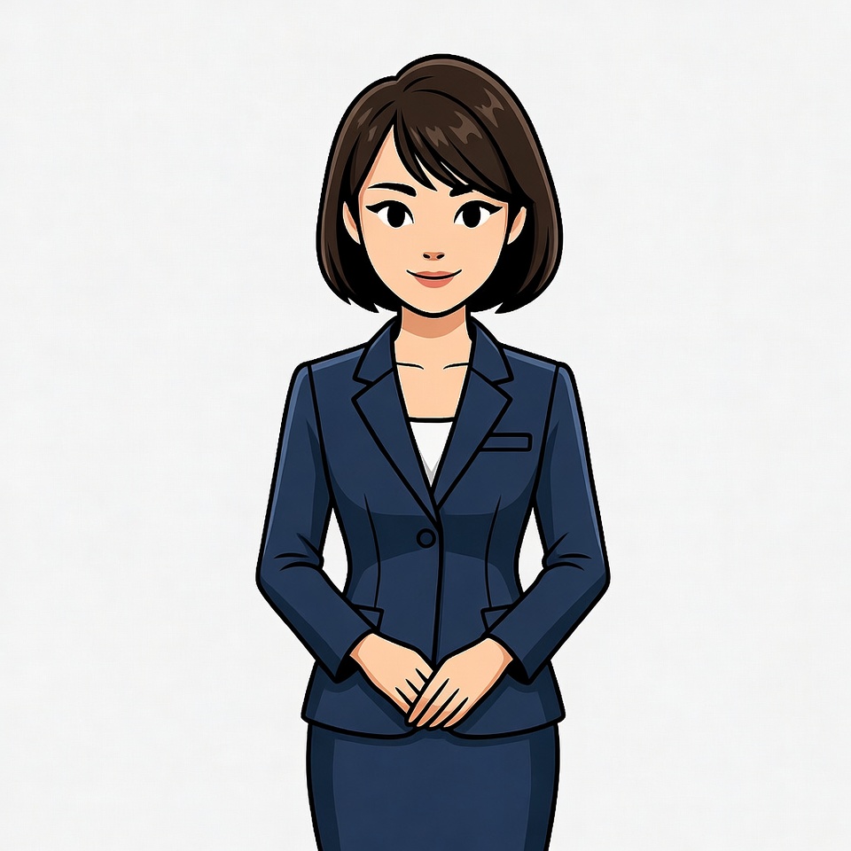 A cartoon illustration depicts an Asian woman with short brown bob hair and a friendly smile. She wears a navy blue business suit with a white blouse and stands with hands clasped in front. The figure is centered on a plain white background.