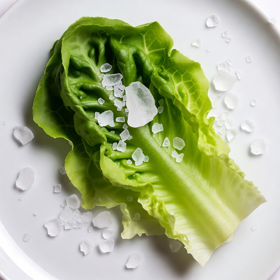 A fresh green lettuce leaf is placed on a white plate. Large crystals of sea salt are sprinkled generously over the lettuce and around it on the plate. The lettuce features crisp, ruffled edges and vibrant green color.