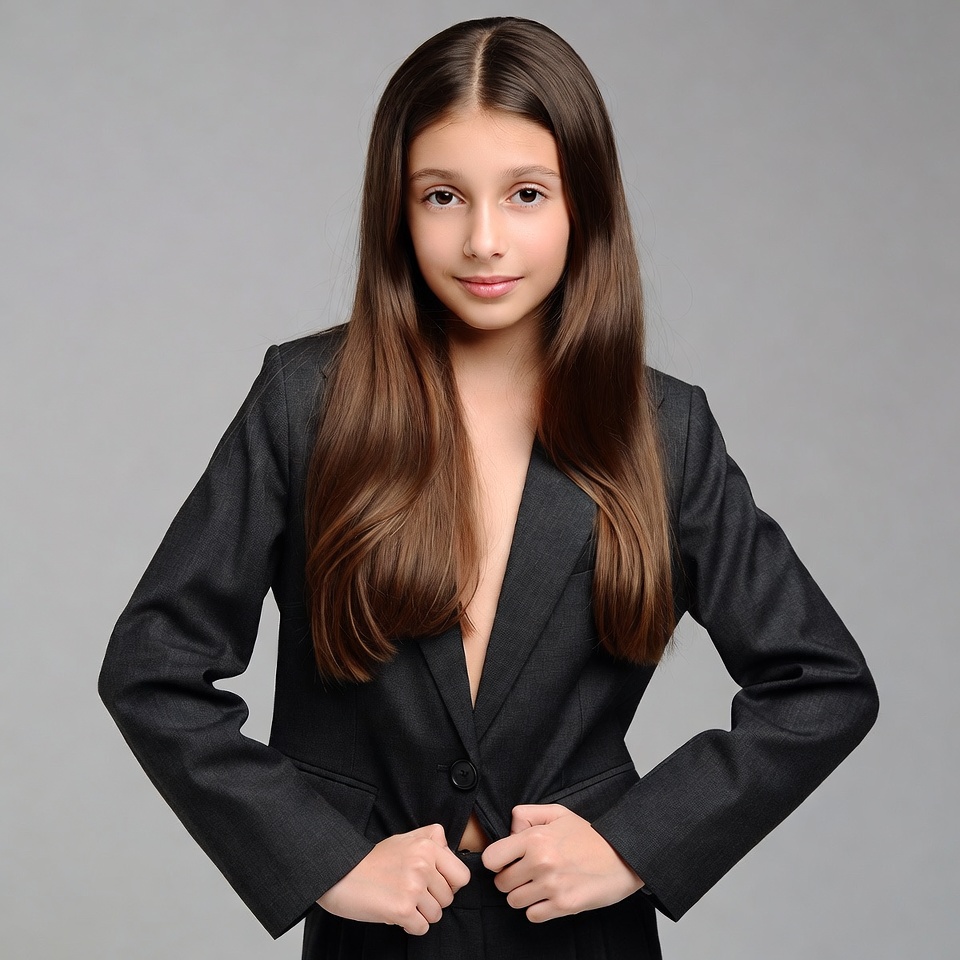 A young girl with long straight brown hair stands smiling against a gray background. She wears a black blazer with an open front, revealing her chest, and has her hands on the lapels. Her expression is confident and friendly.