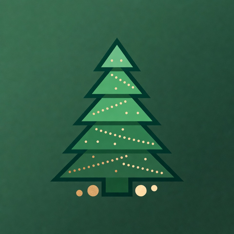 A simple green Christmas tree illustration features a triangular pine shape with white and gold lights strung across its branches. The tree stands on a dark green gradient background with small glowing dots at its base. It has a flat, clipart-style design with subtle metallic accents.