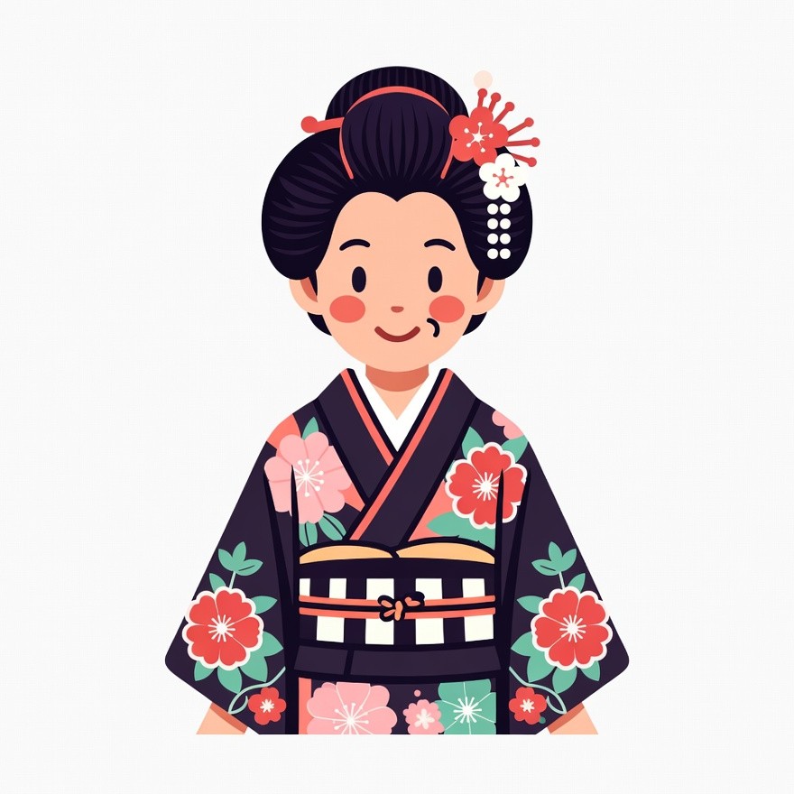A cheerful Asian woman with a traditional black updo hairstyle adorned with red flowers smiles happily. She wears a vibrant kimono featuring pink and red floral patterns with a wide obi sash. The illustration is set against a plain background.