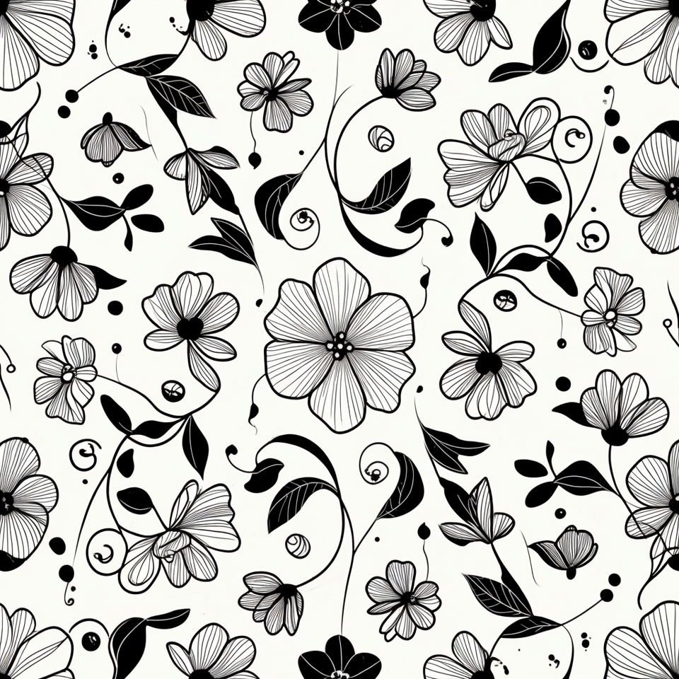 A seamless black and white illustration features various open flowers with detailed petals and leaves. Thin stems and vines connect the floral elements across a repeating pattern. The design uses bold outlines on a white background.