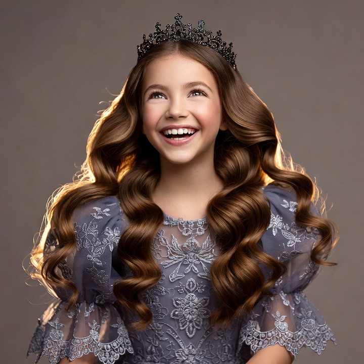 A young girl with long wavy brown hair smiles happily while wearing a sparkling black crown. She is dressed in a lacy gray gown with puffed sleeves and lace details. The image features a neutral gray background.