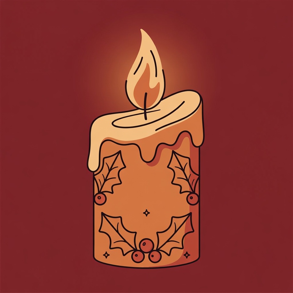A line art illustration of a tall beige candle with dripping wax and a glowing orange flame on a deep red background. The candle is decorated with holly leaves and red berries around its base. The design features clean outlines and vibrant colors for a festive holiday look.