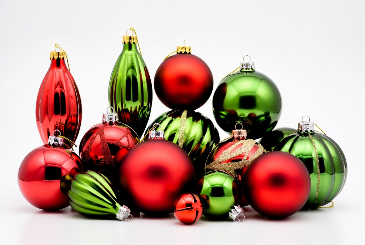 Christmas balls, Christmas decor, baubles pile, festive decor, gold hooks, green ornaments, holiday decorations, holiday season, metallic finish, ornament collection, red ornaments, round ornaments, shiny baubles, swirled designs, teardrop ornaments, white background, Christmas ornaments