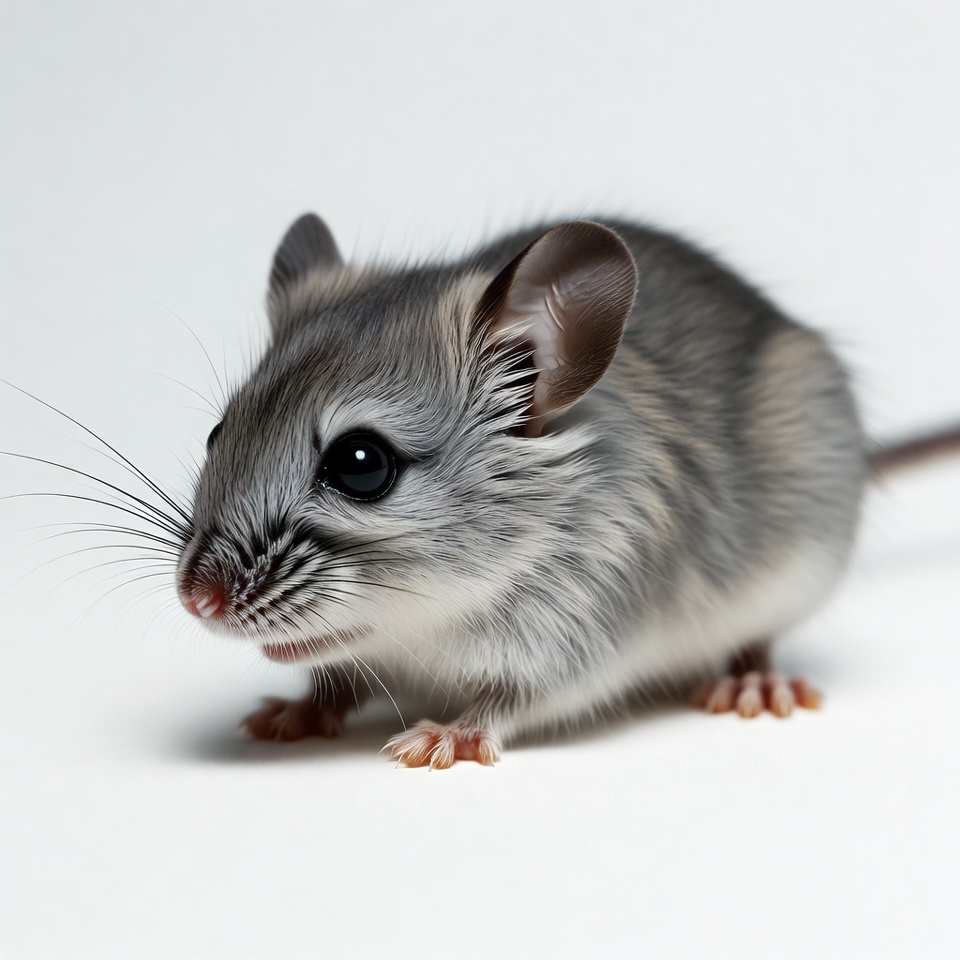 A small gray mouse with large black eyes and long whiskers stands on a plain white background. Its soft fur features light stripes, and its pink nose and tiny paws are visible. The mouse faces forward with a curious expression.