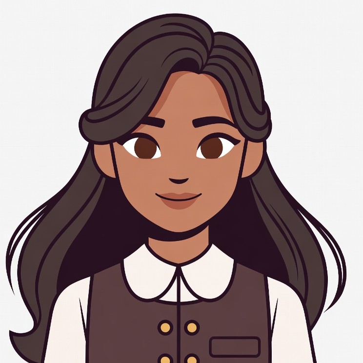 A cartoon illustration of a young girl with long dark brown hair smiles at the viewer. She wears a white collared blouse under a brown pinafore vest with gold buttons. The image features her face and upper body on a plain white background.